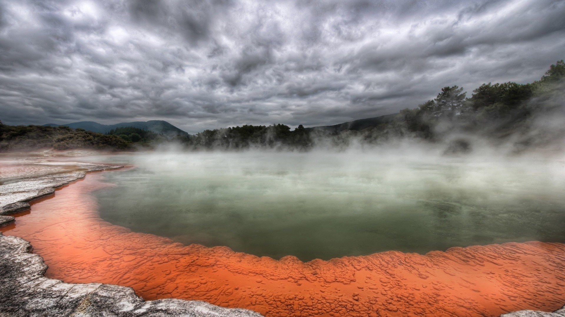 Nevoeiro sobre a superfície da água. Céu nublado