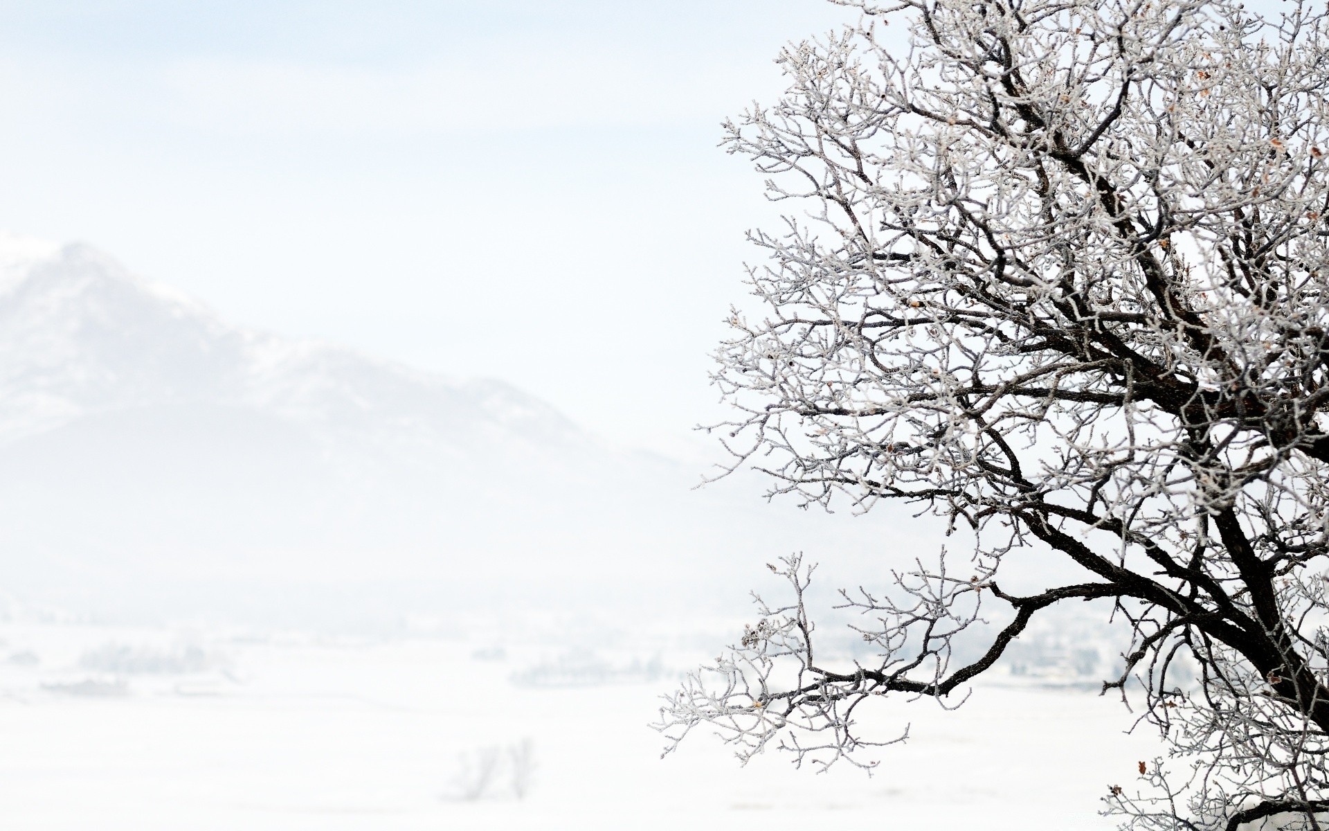 Árvore em primeiro plano com fundo de Inverno e montanhas
