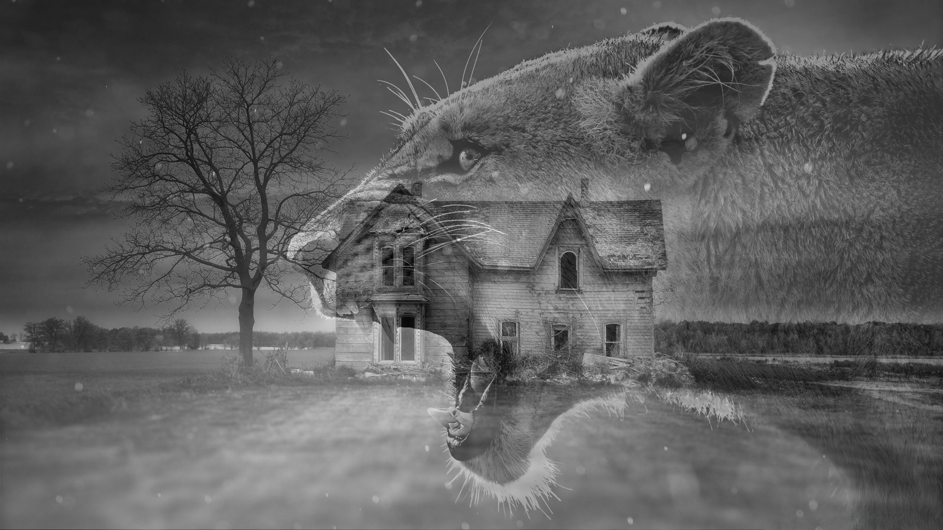 Uma foto em preto e branco mostra um inverno lince no fundo de uma casa e uma árvore