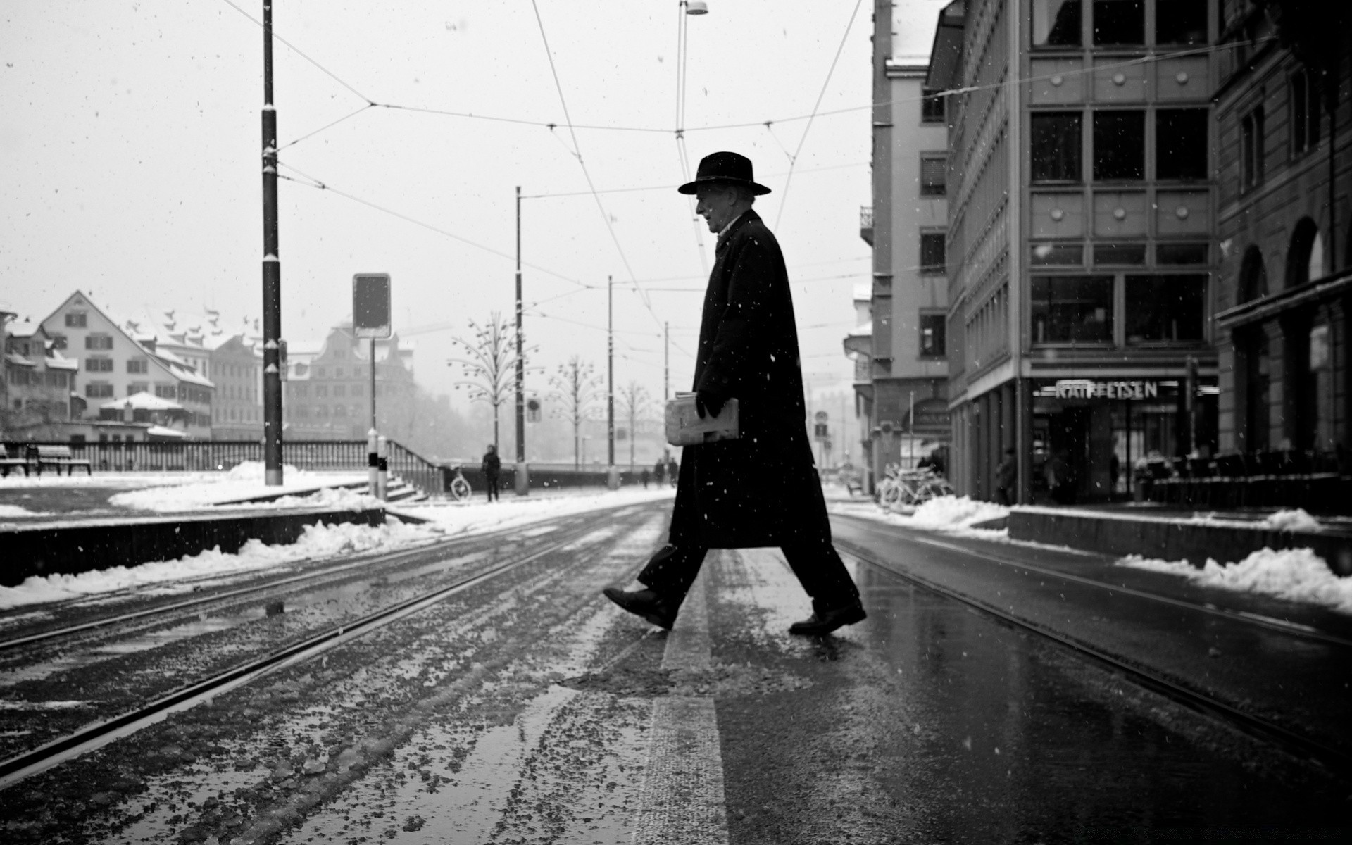 Imagem em preto e branco de um cruzamento ferroviário