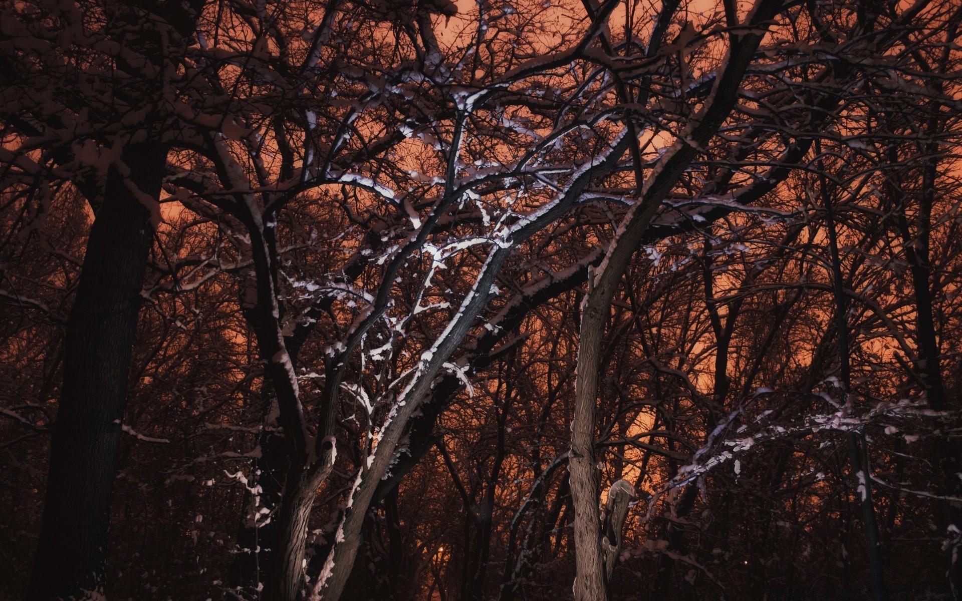 Ramos de árvores cobertas de neve no fundo de um pôr do sol roxo