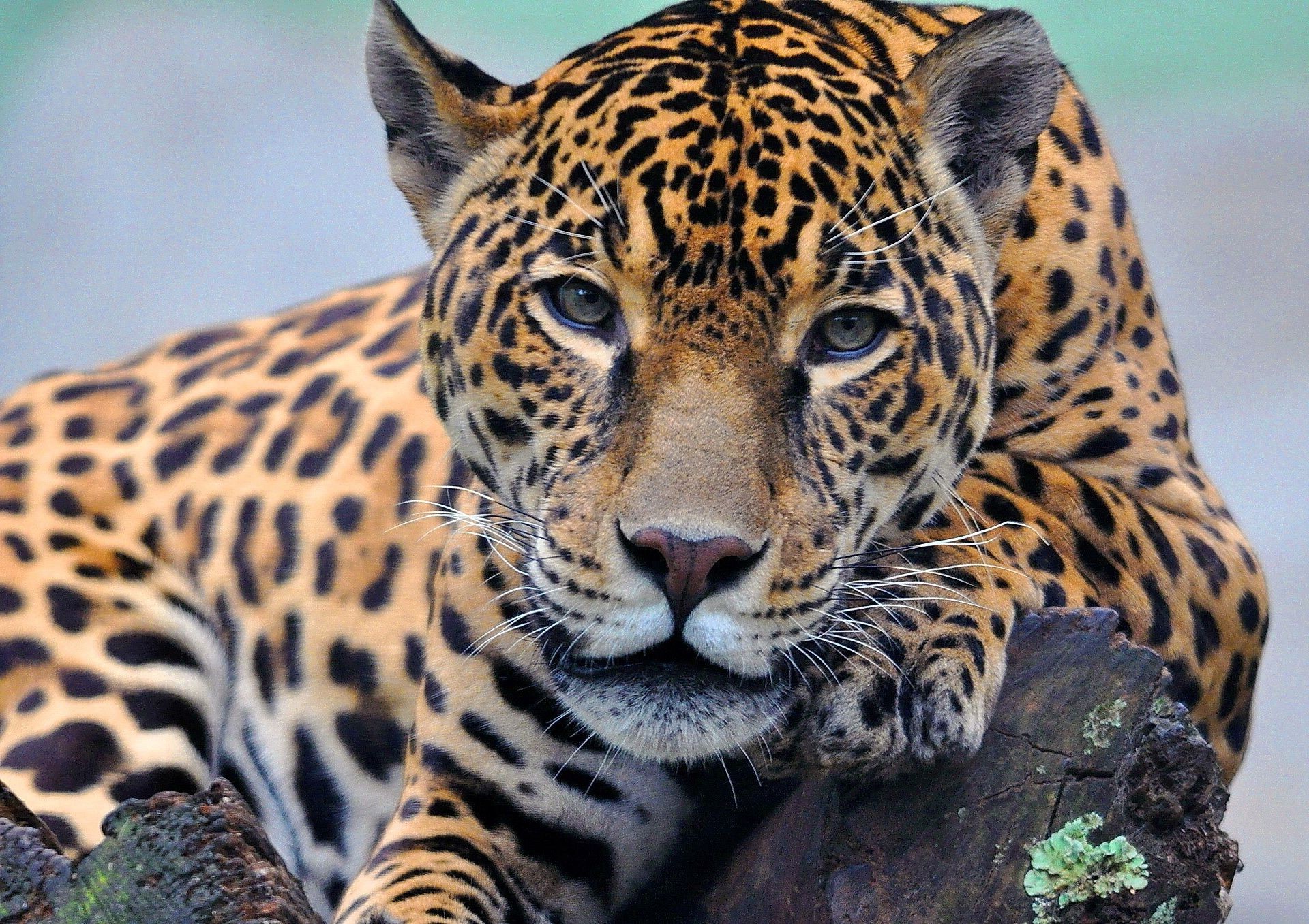 Leopardo olha para o quadro deitado em um tronco