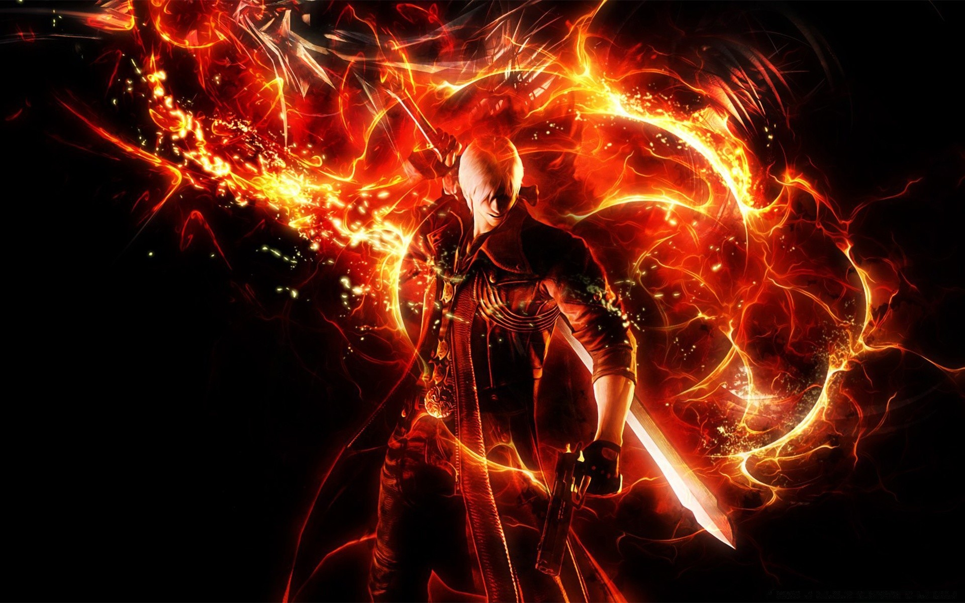 O homem é um guerreiro em meio a fogo e fumaça. Fantasia em fundo escuro