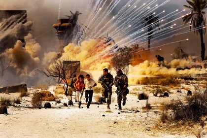 Pessoas fugindo de explosões no deserto