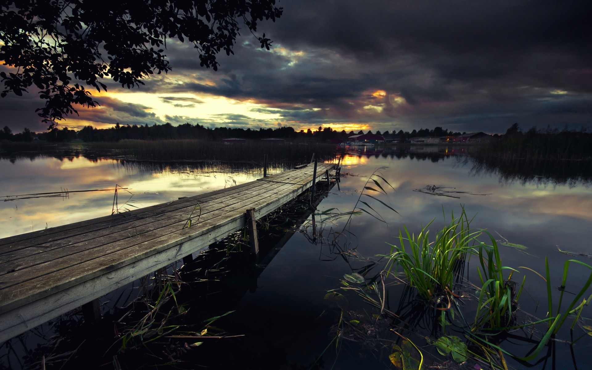 Salgueiro inclinado no lago, reflexo da vegetação na água