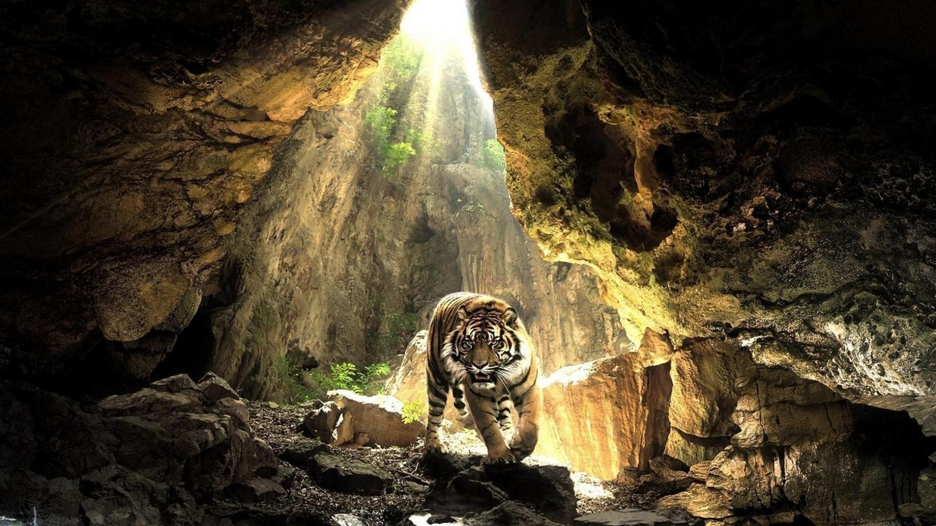Tigre na caverna iluminado pelo sol