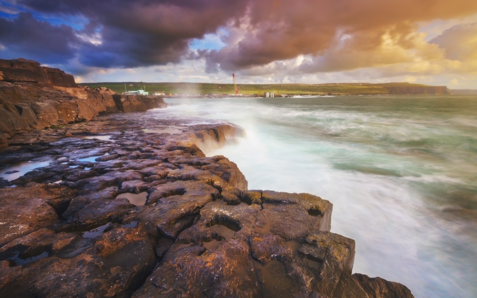 Uma corrente impetuosa em cascata sobre as pedras, um farol solitário é visto à beira desta corrente