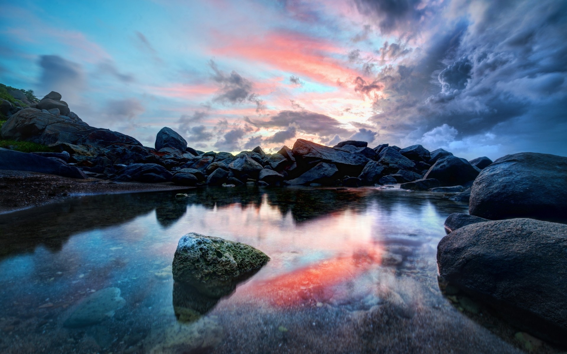 Pôr do sol em chamas na costa rochosa