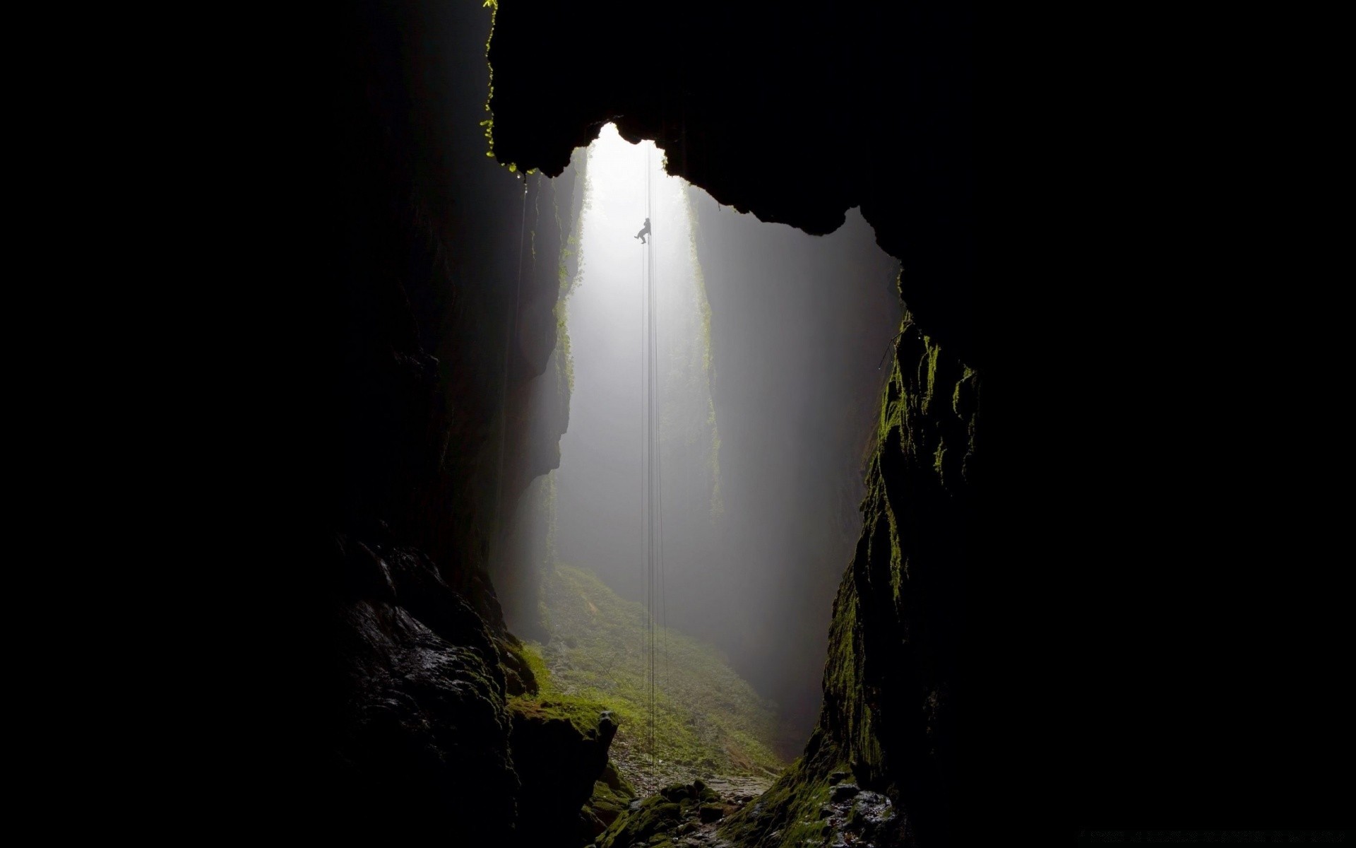 Um corpo de água entre as rochas verdes envoltas em neblina
