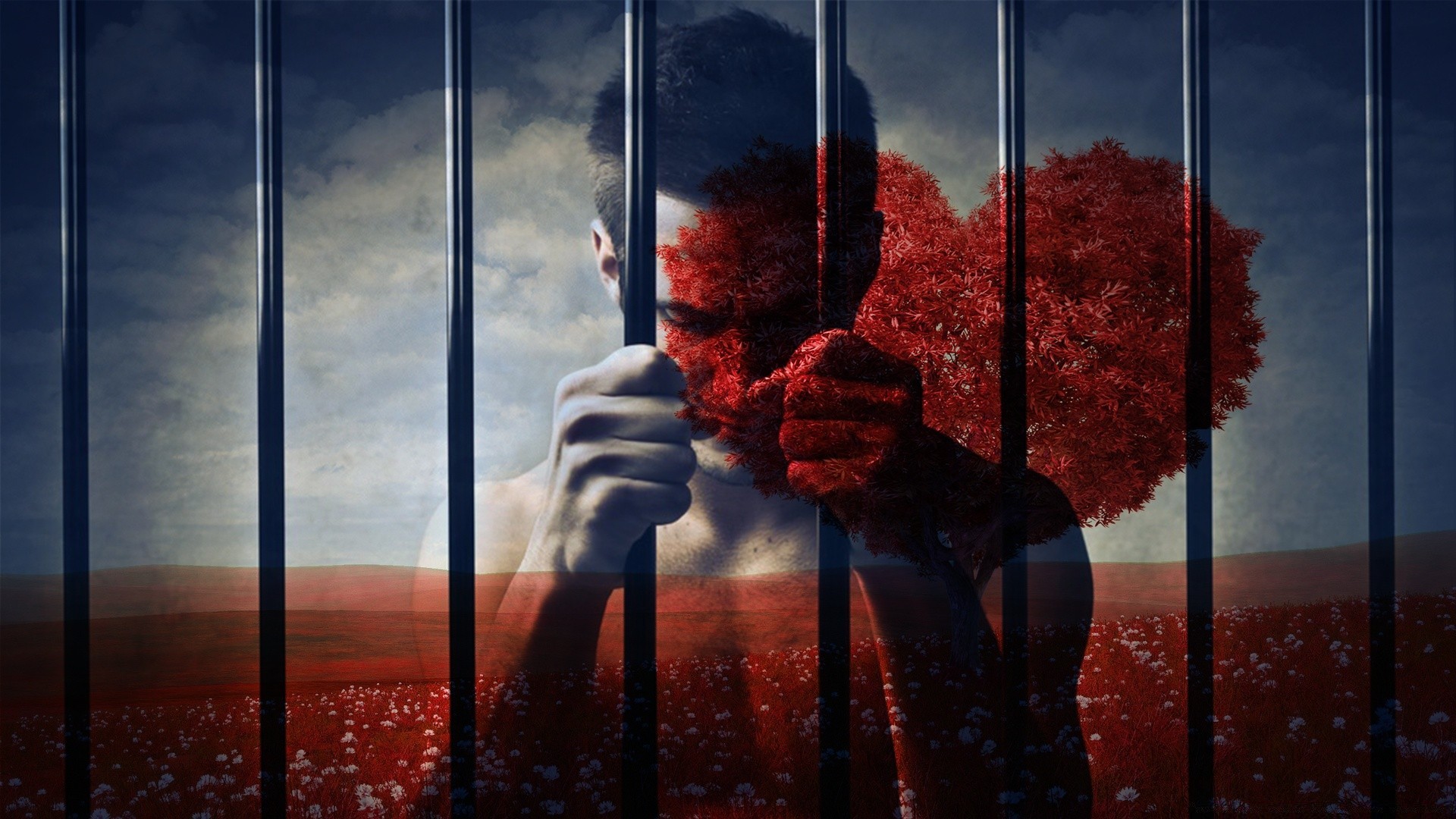 Homem sentado atrás de uma grade e triste