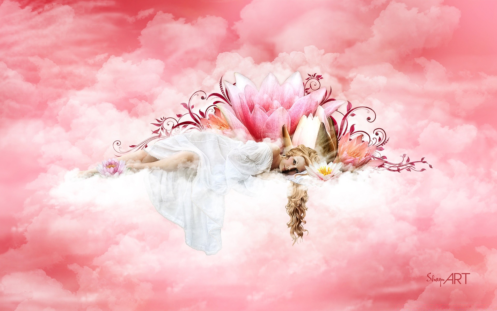Menina bonita em nuvens cor-de-rosa