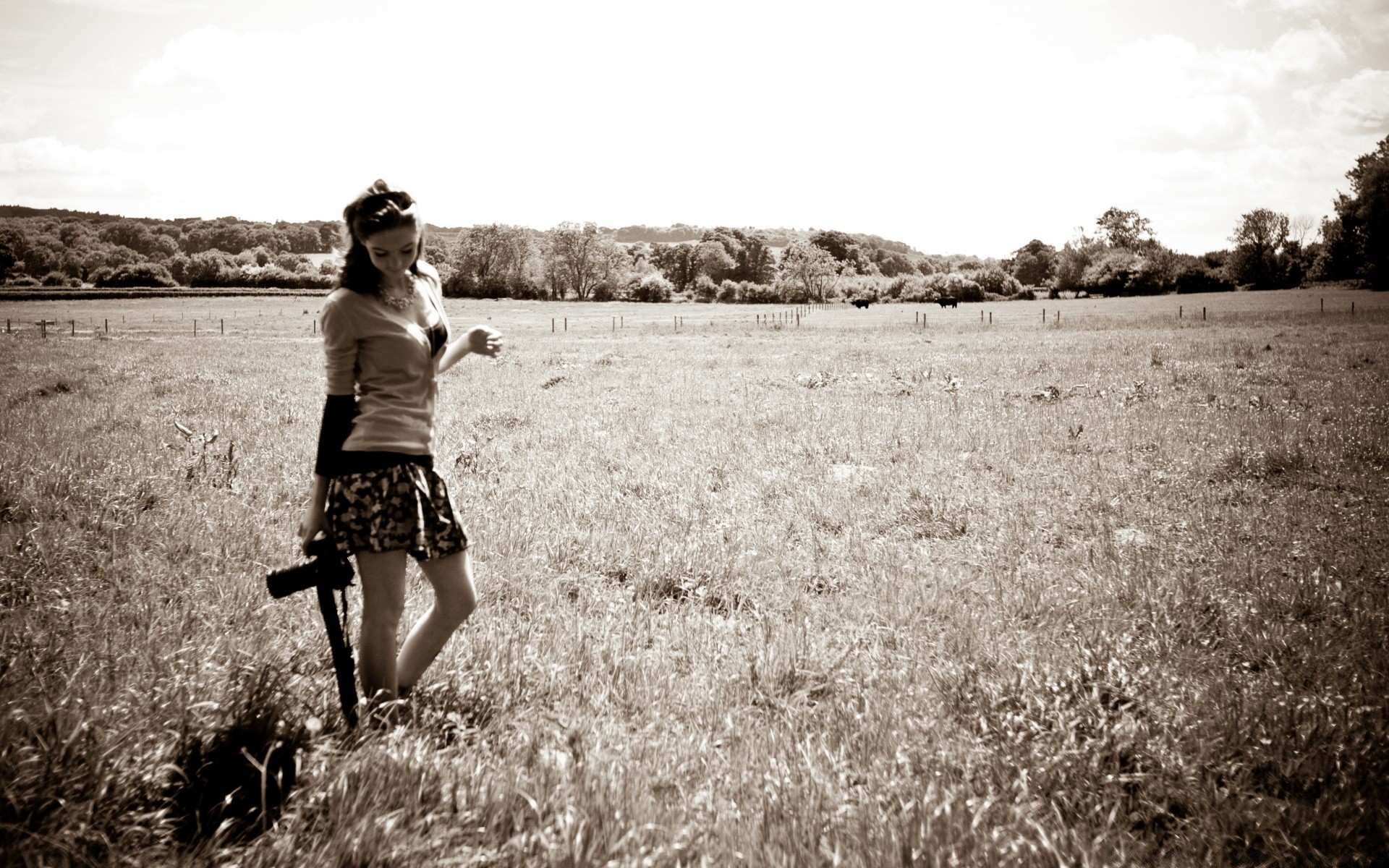 Menina adulta em uma mini-saia no campo em uma foto em preto e branco