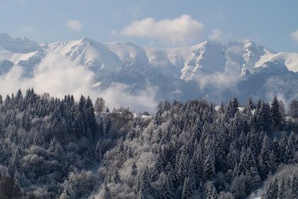 Paisagem de Inverno de montanha com floresta