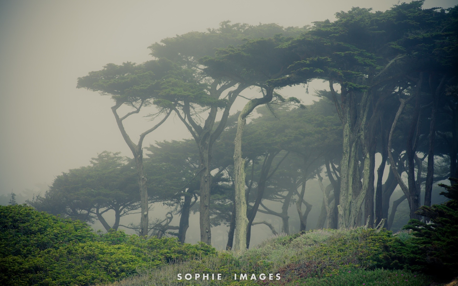Árvores centenárias pela manhã no nevoeiro