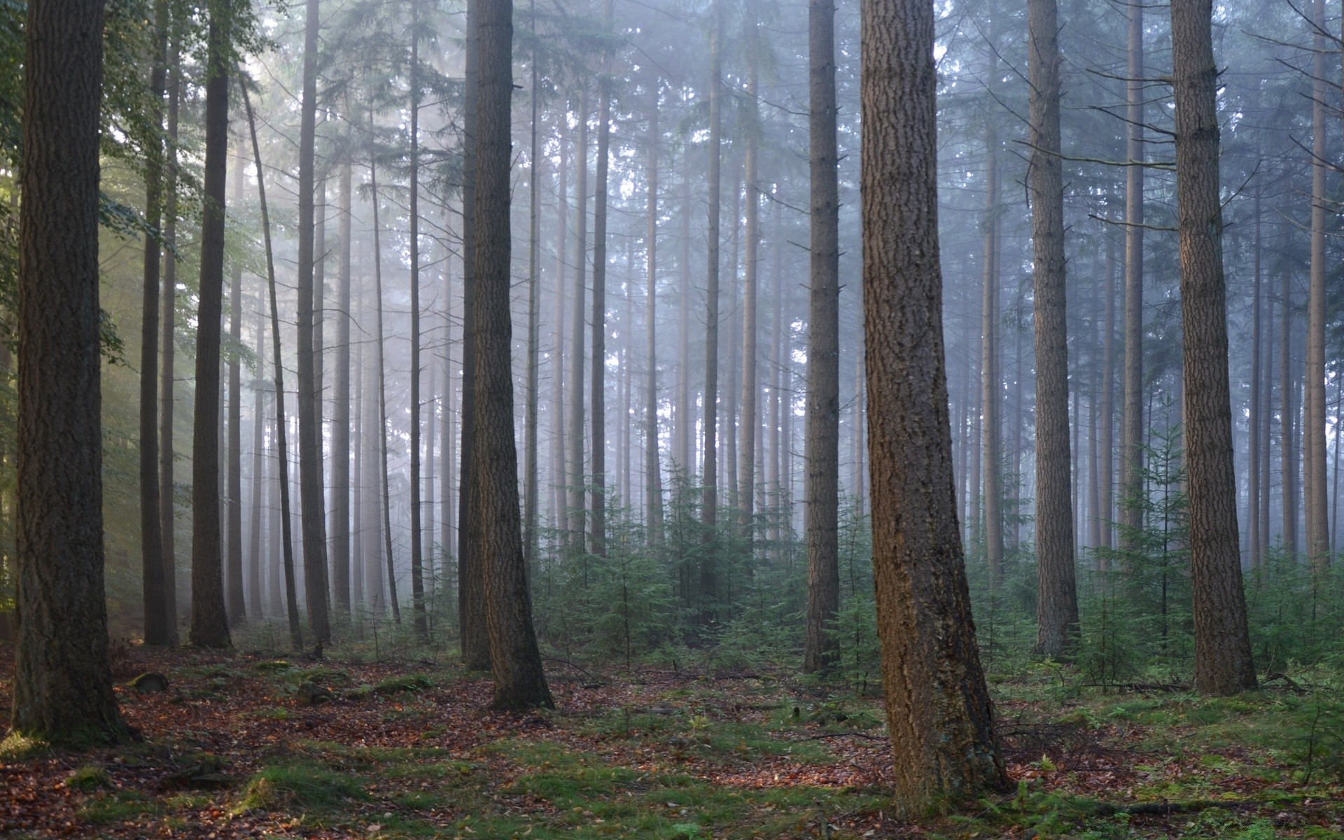 Floresta até o céu. Bela paisagem em uma névoa leve