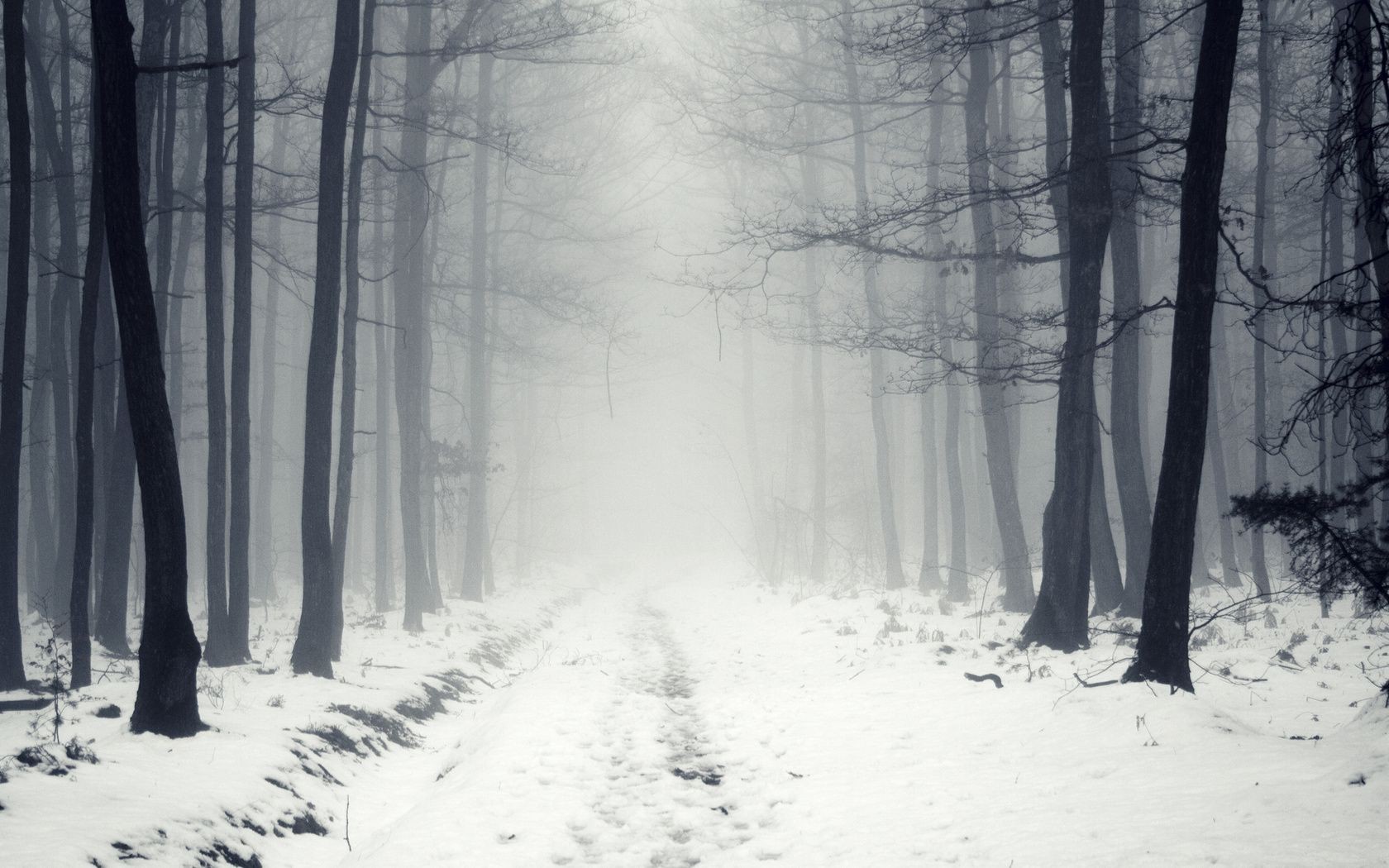 Árvore com folhas amareladas na névoa da névoa na floresta nas montanhas