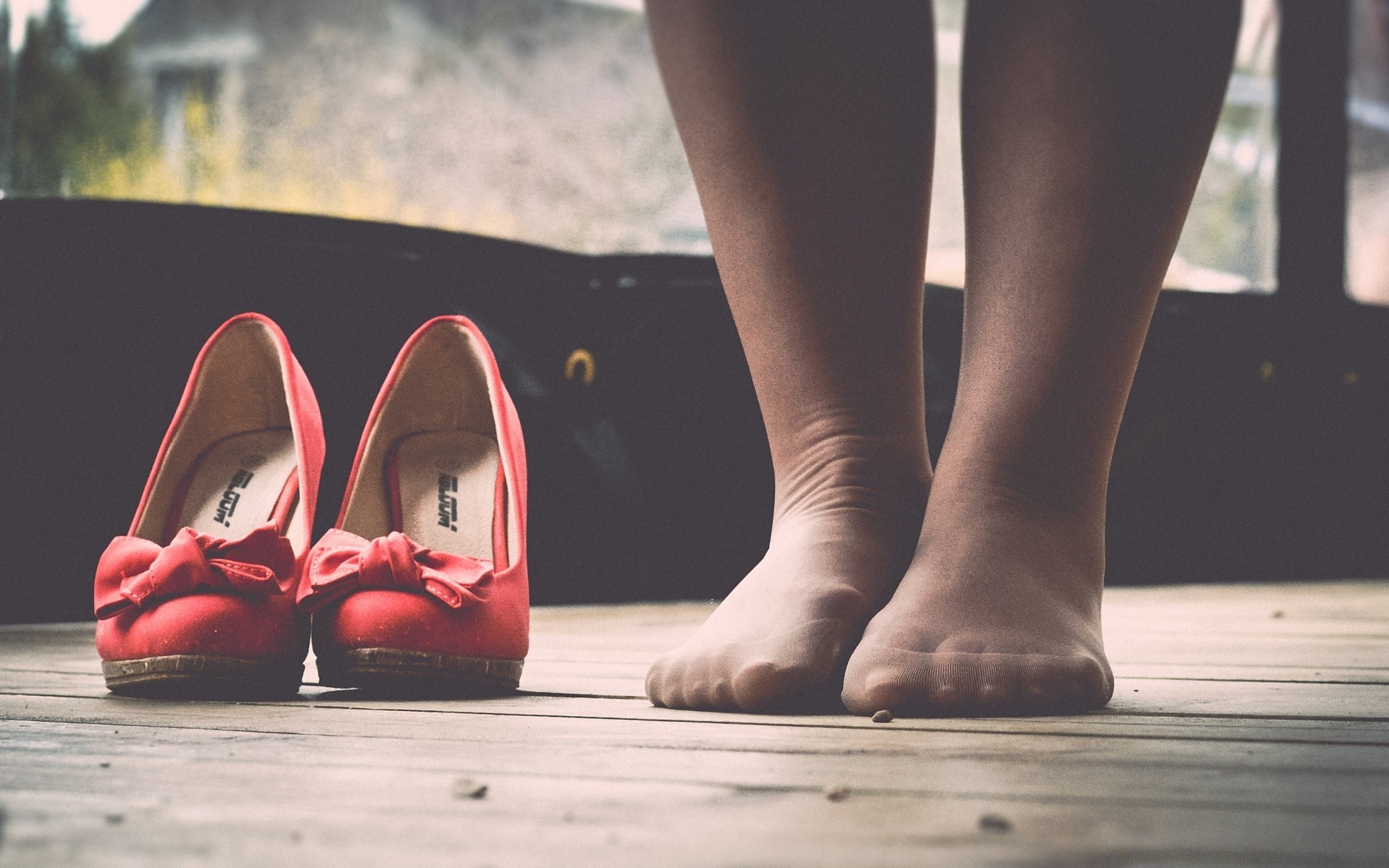 Pés de mulher e sapatos no chão