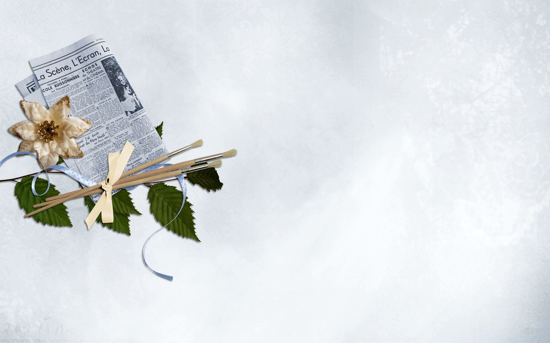 Vintage. Jornal novo. Pincel. Flor seca