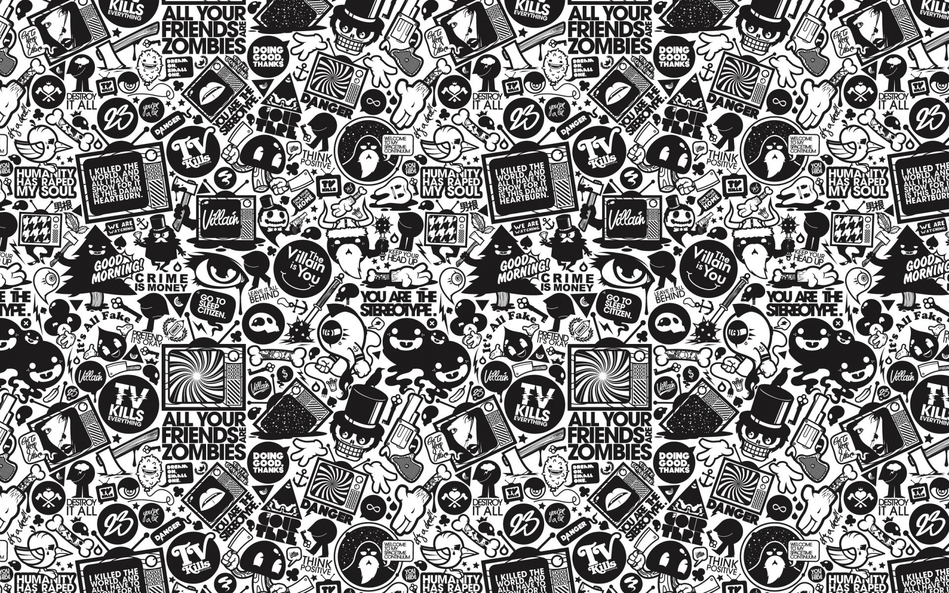 Imagem em preto e branco de personagens e personagens de desenhos animados