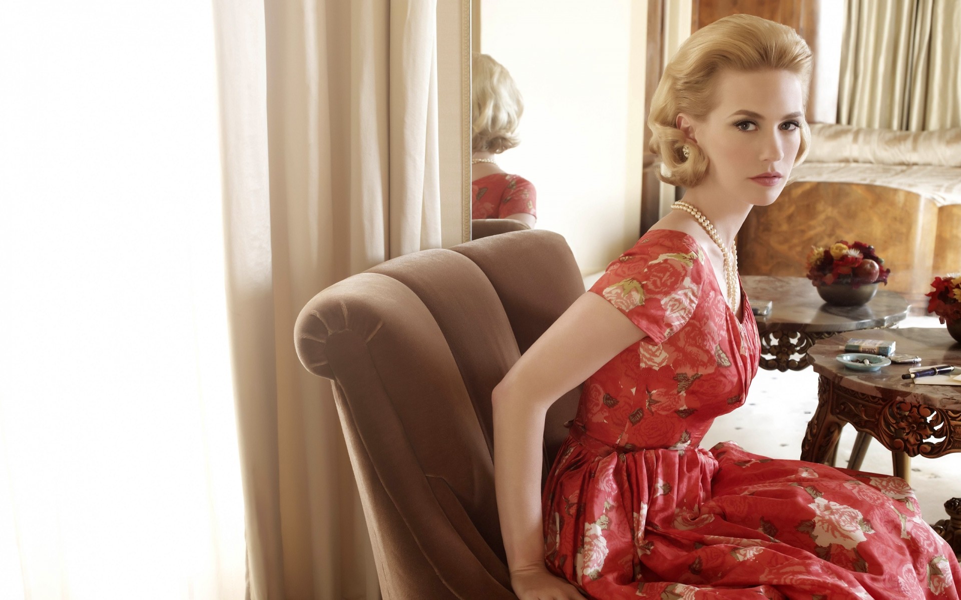 Mulher adulta em vestido vermelho no quarto senta-se na mobíliaMulher adulta em vestido vermelho no quarto senta-se na mobília