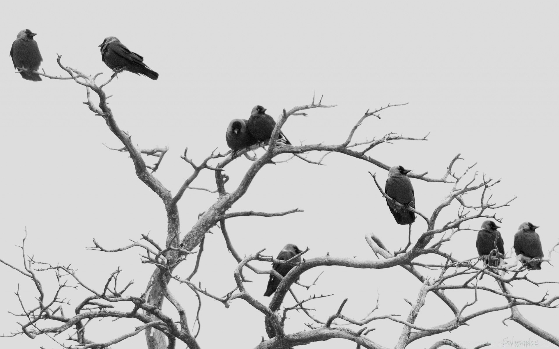 Muitos pássaros se sentam em uma árvore sem folhas