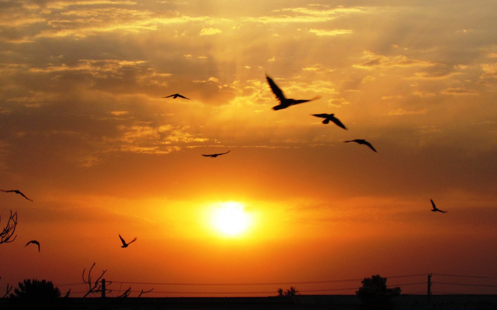 Pássaros voando ao pôr do sol