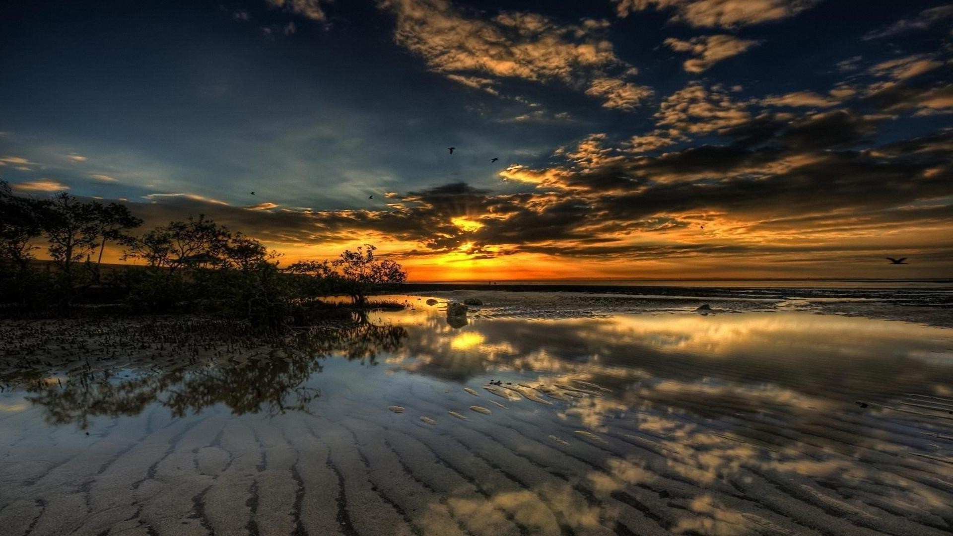 Pôr do sol sobre a superfície da água