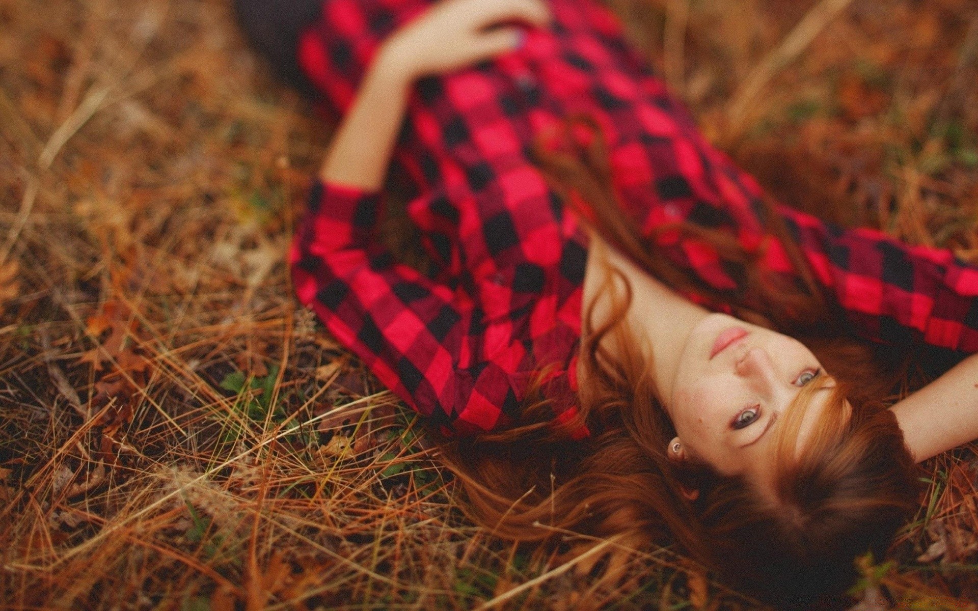 Menina em uma camisa fofa encontra-se na grama seca