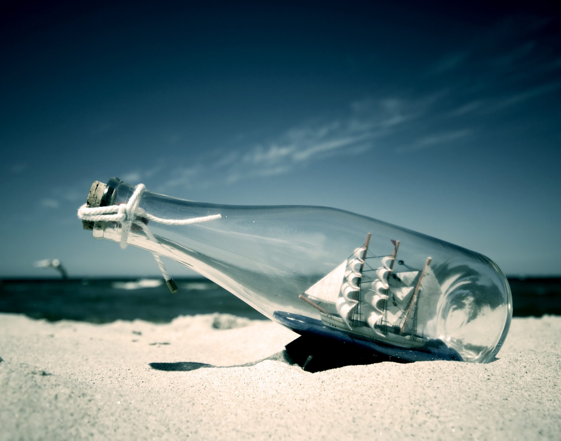 Barco em garrafa do mar na areia