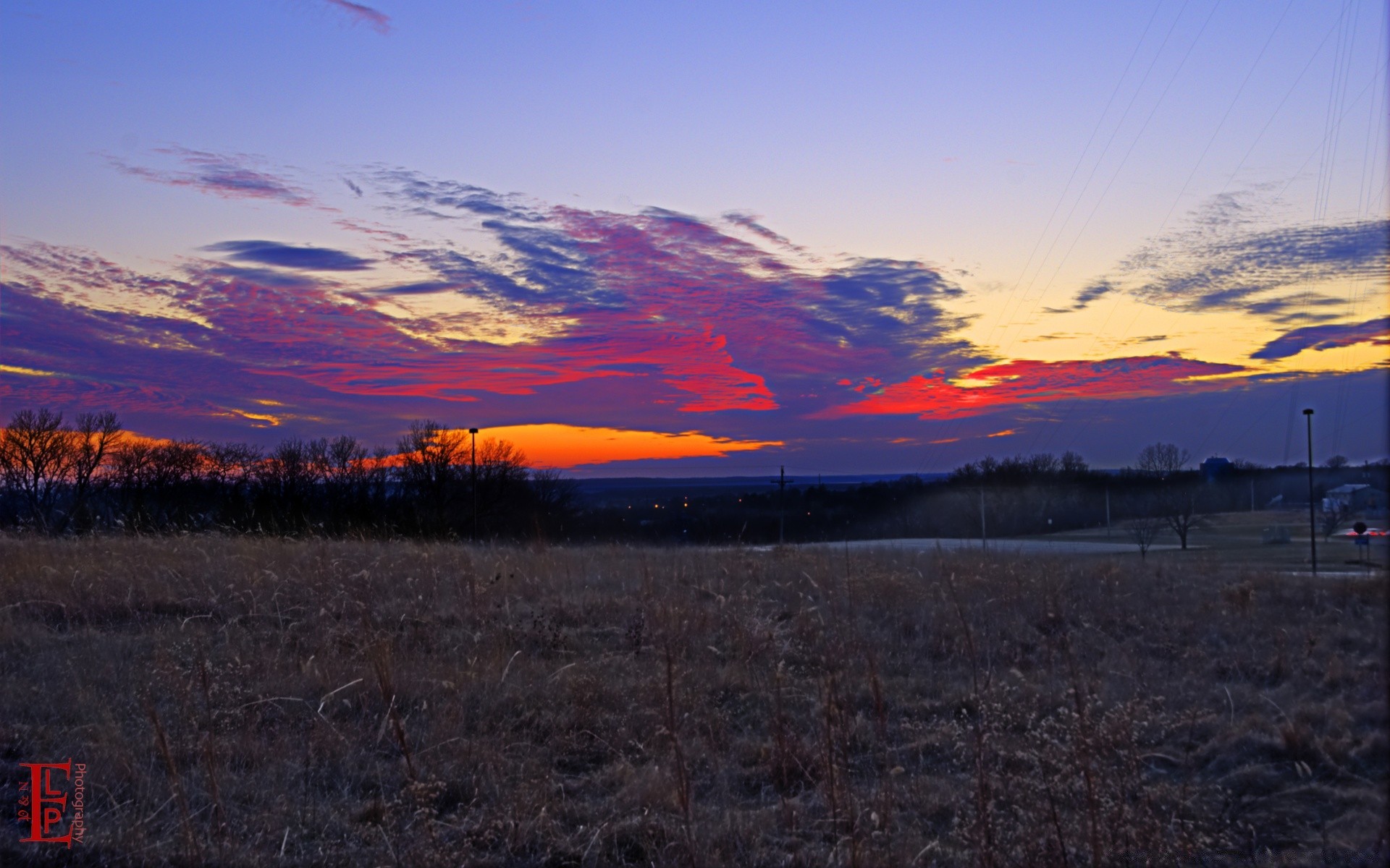 Pôr do sol nas nuvens sobre o Lago Vista da colina