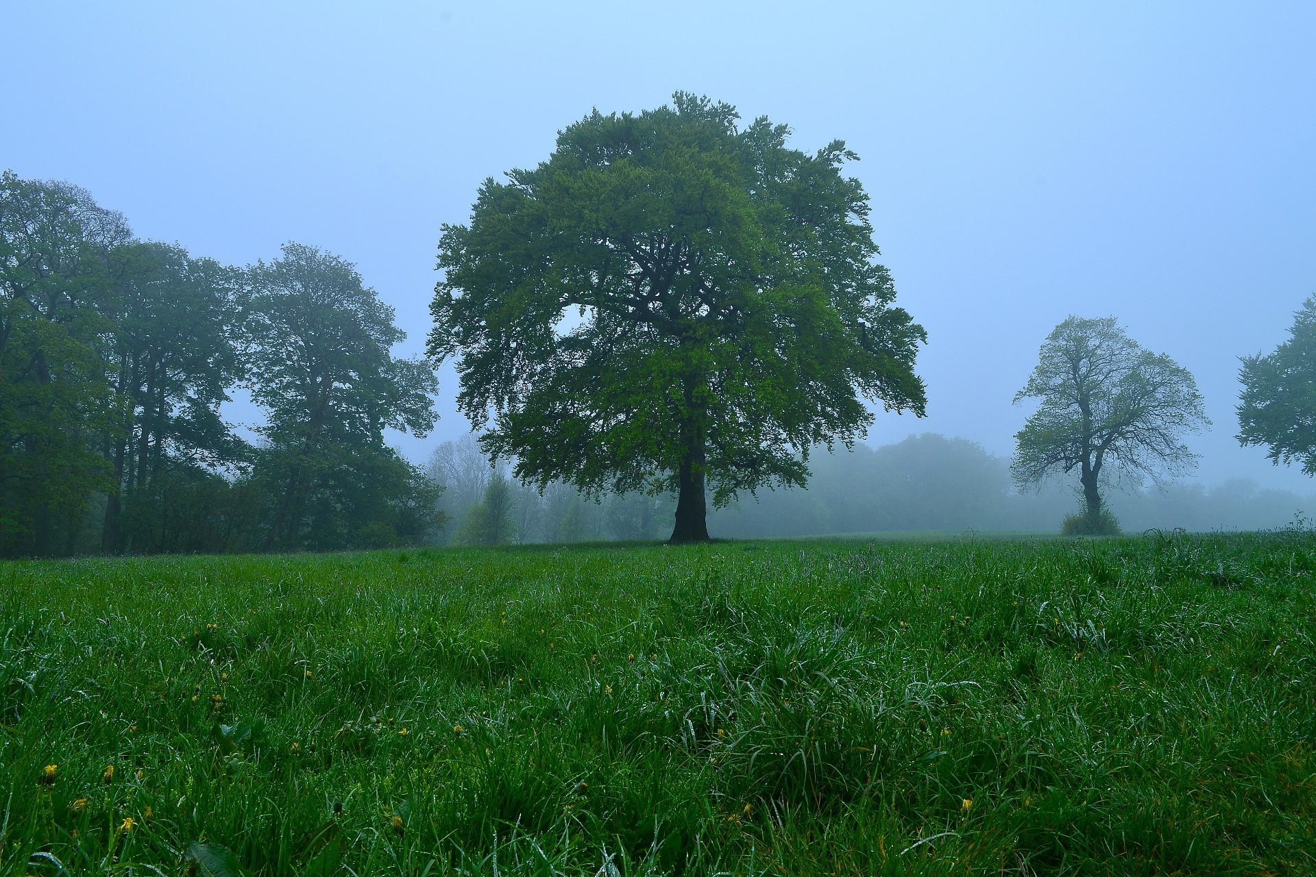 Árvore com galhos espalhados em um prado verde suculento
