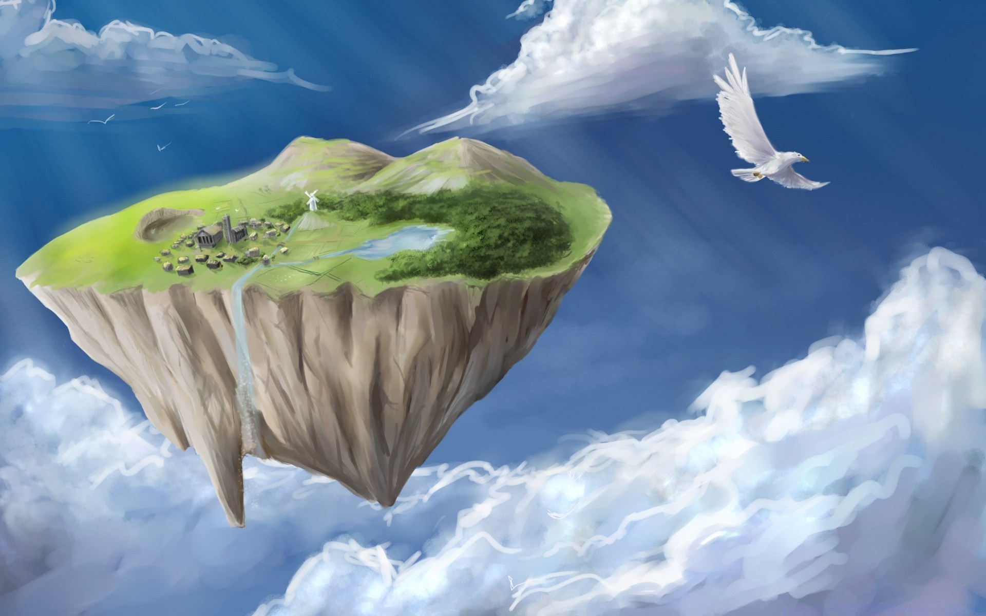 Um pedaço de terra voando no fundo do céu de onde uma cachoeira e uma águia branca fluem