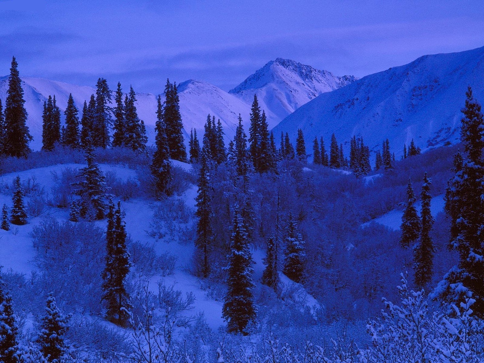 Paisagem de Inverno, terreno montanhoso e floresta de coníferas