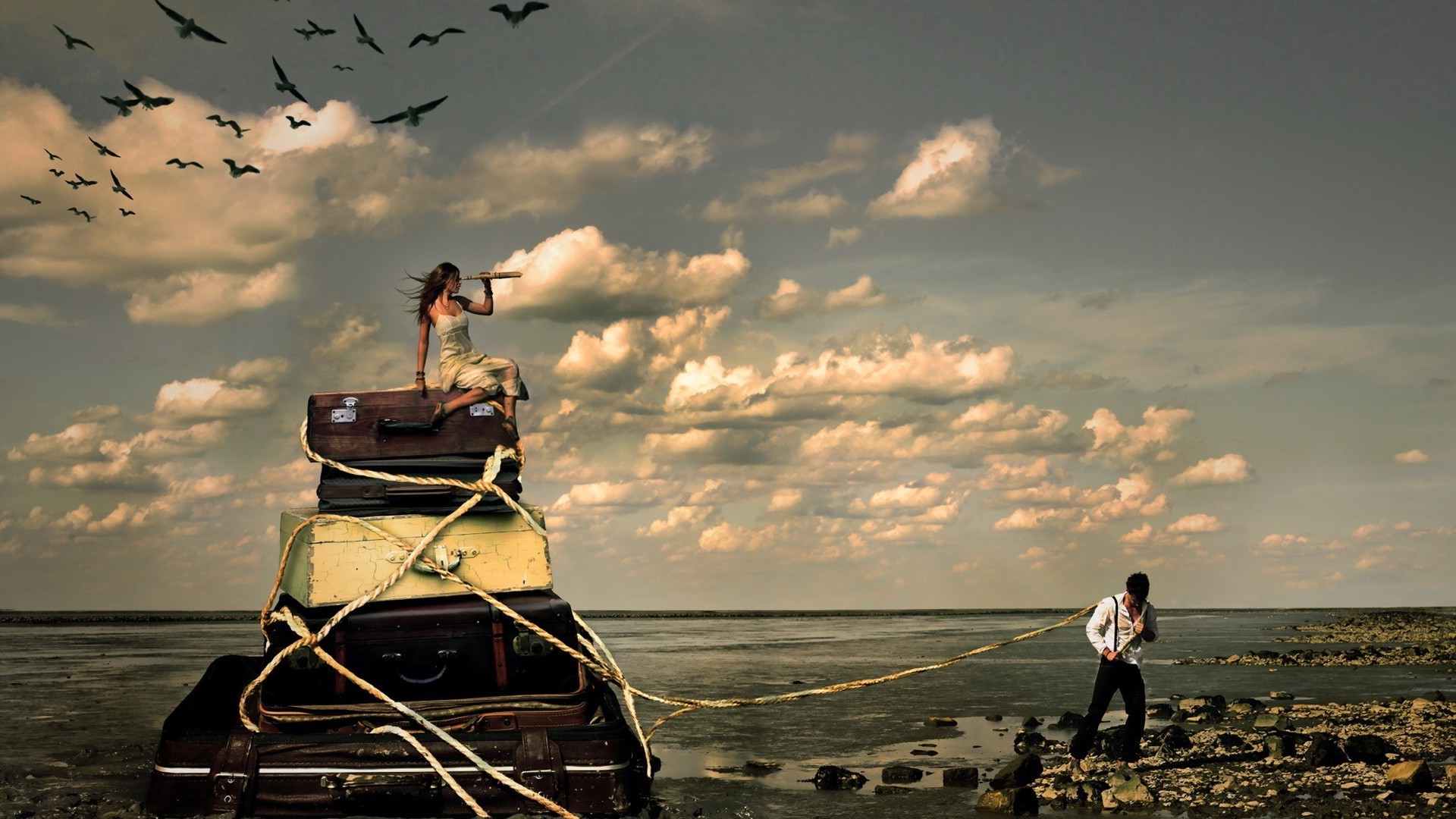 Homem puxa as malas de uma menina bonita na praia como um Burlak
