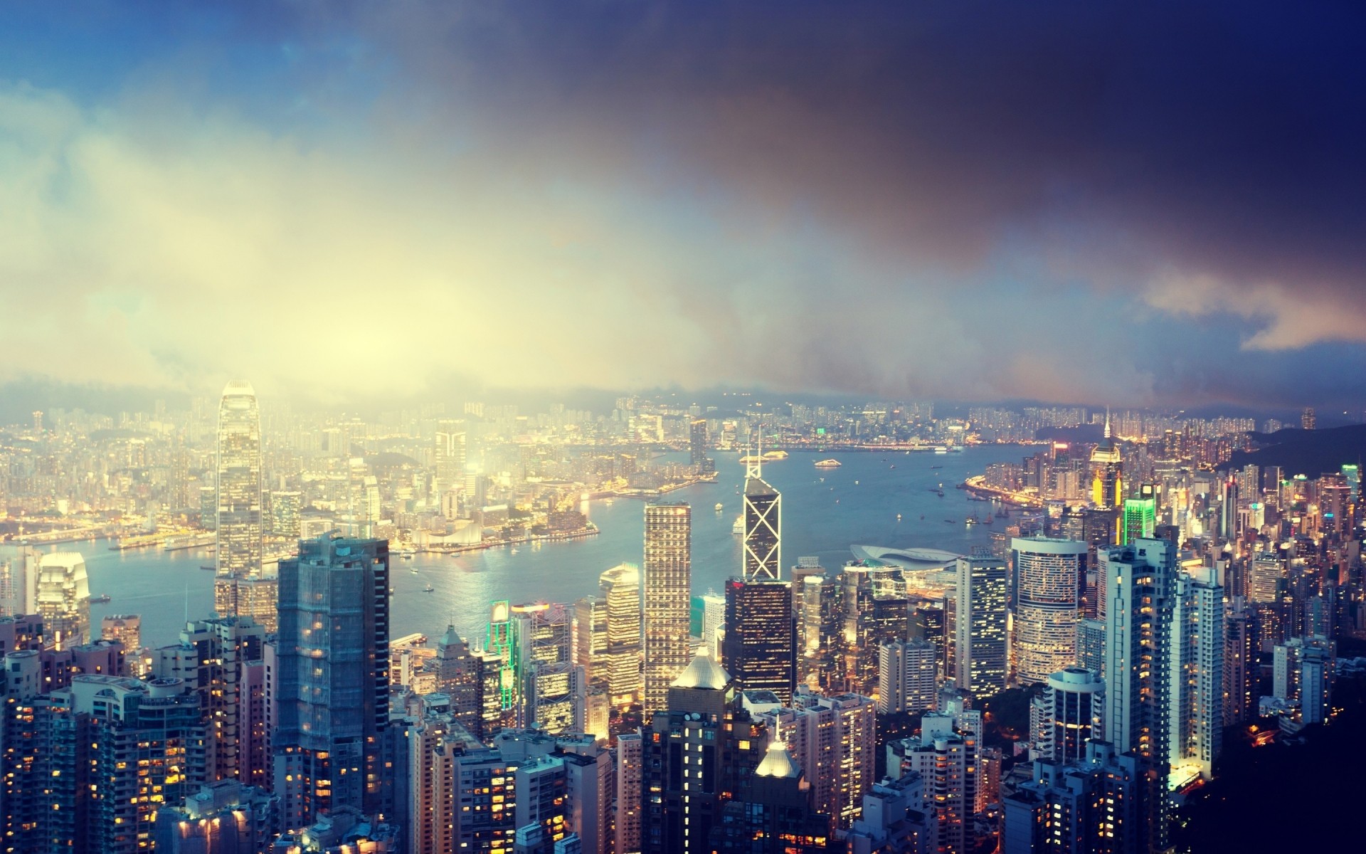 Magnífica vista de cima dos arranha-céus da metrópole, a baía, o céu nublado