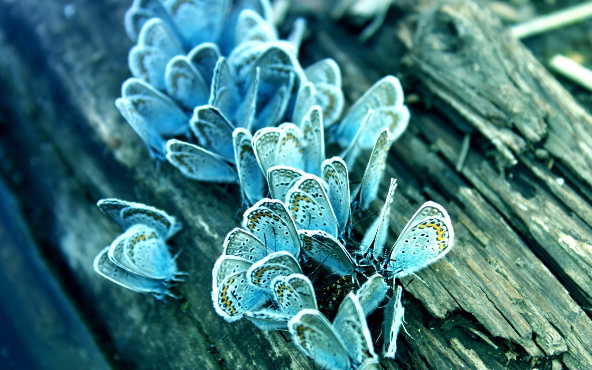 Muitas borboletas azuis em um tronco podre