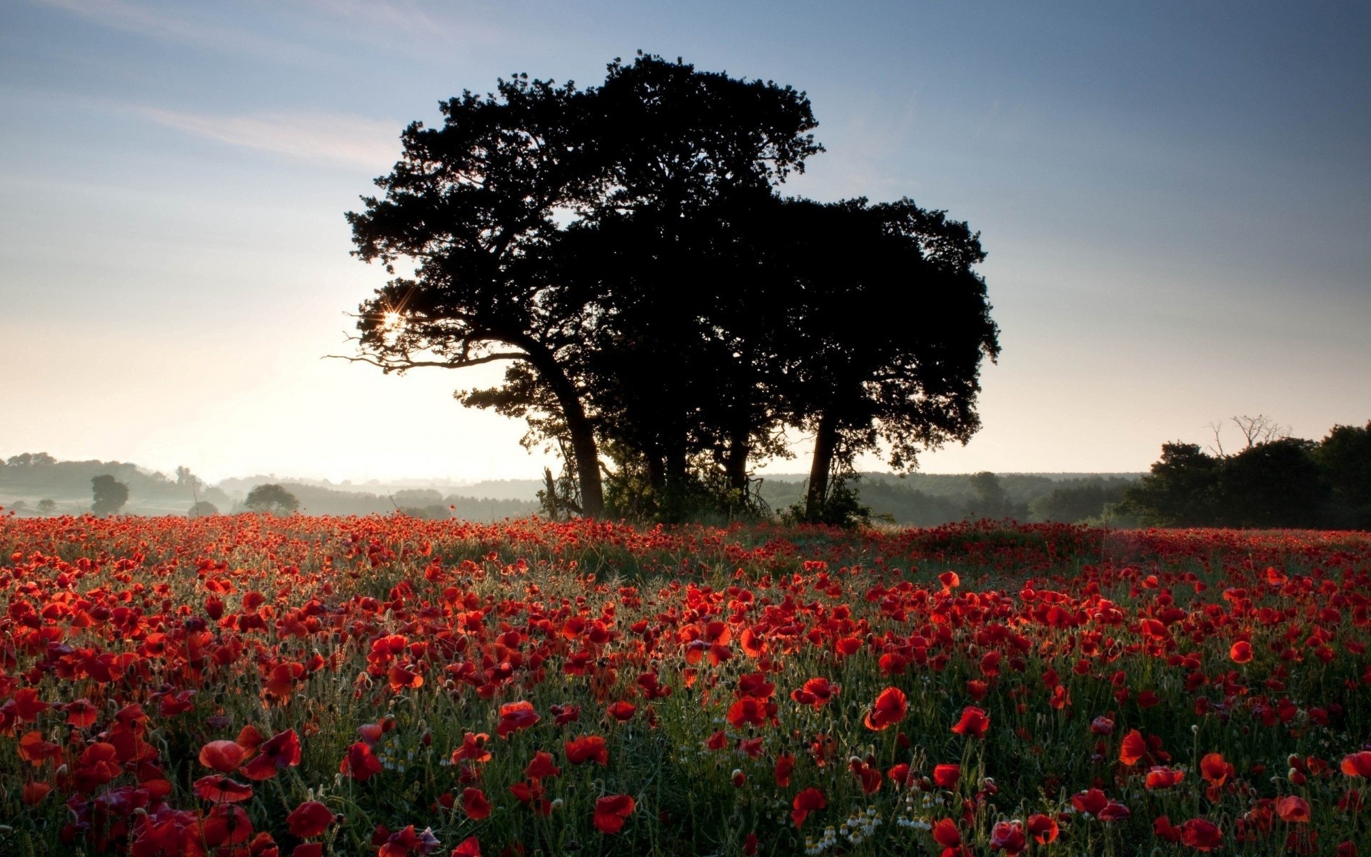 Campo de flores e árvores