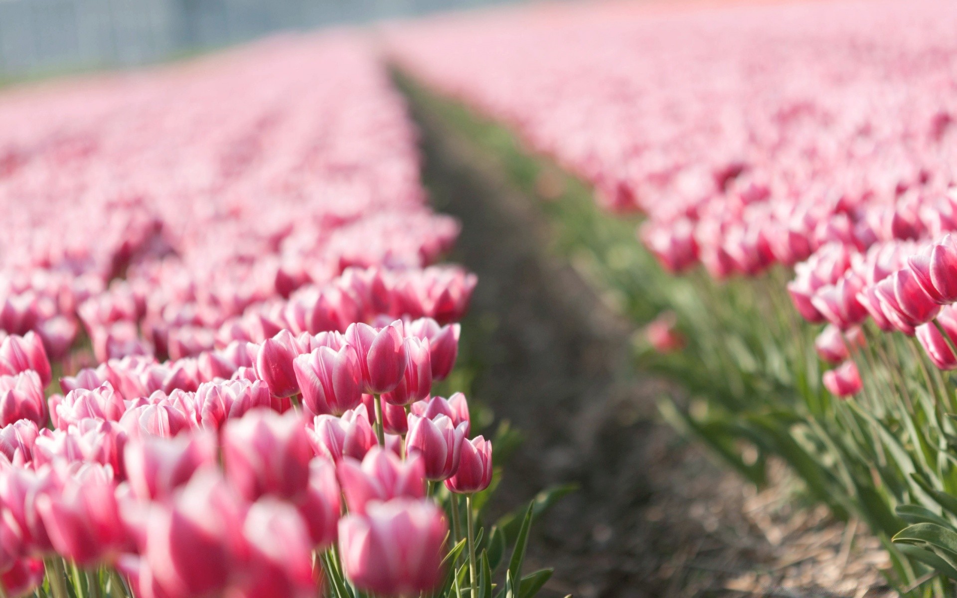 Campo de tulipas vermelhas e brancas sobre um fundo desfocado