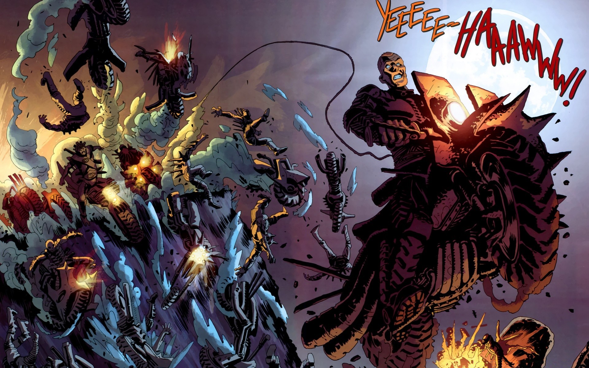 Dois vonlv com uma metralhadora e sabre de luz contra monstros