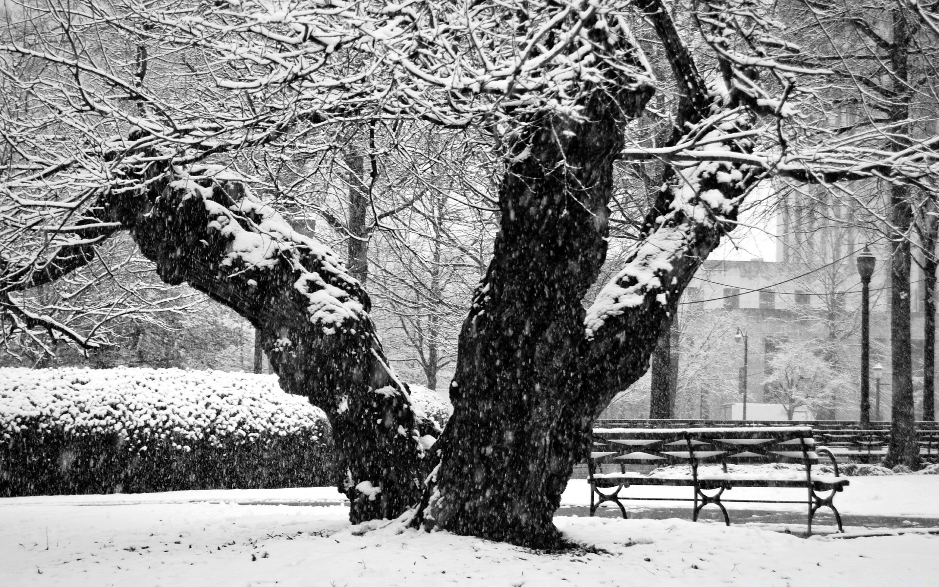 Paisagem urbana com pequenas árvores de natal cobertas de nevePaisagem urbana com pequenas árvores de Natal cobertas de neve