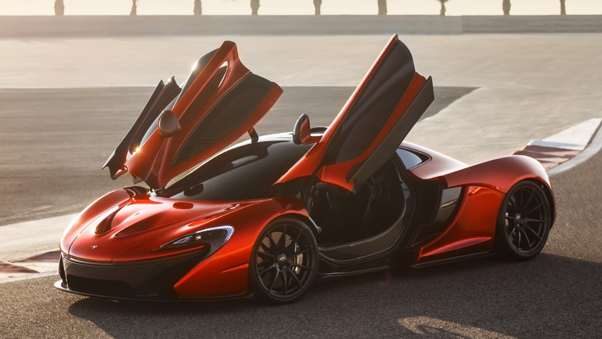 Um Chevrolet vermelho fica em uma estrada de terra no fundo das montanhas