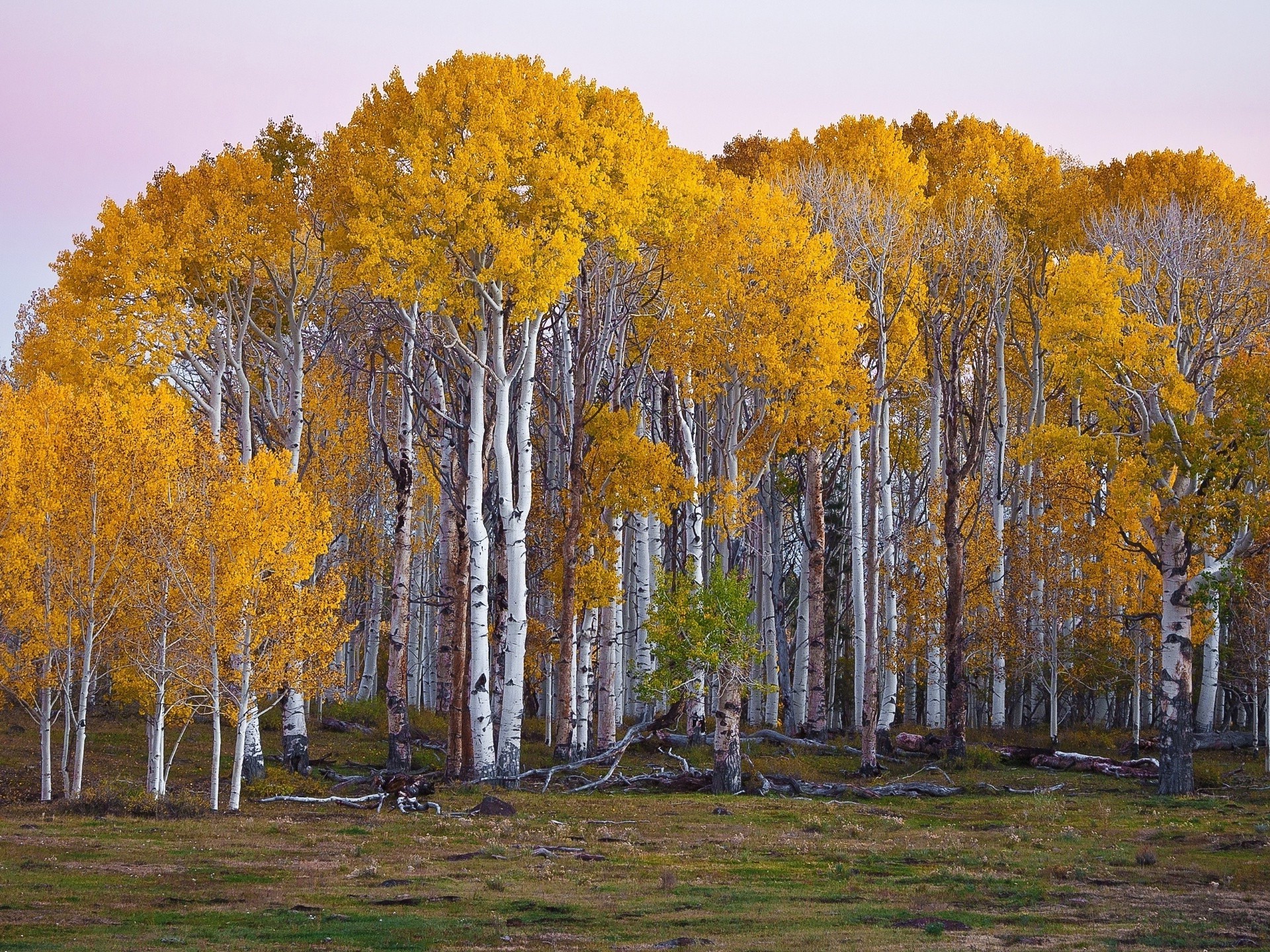 Troncos de bétulas brancas entre as folhas amarelas, iluminados pelo sol do outono