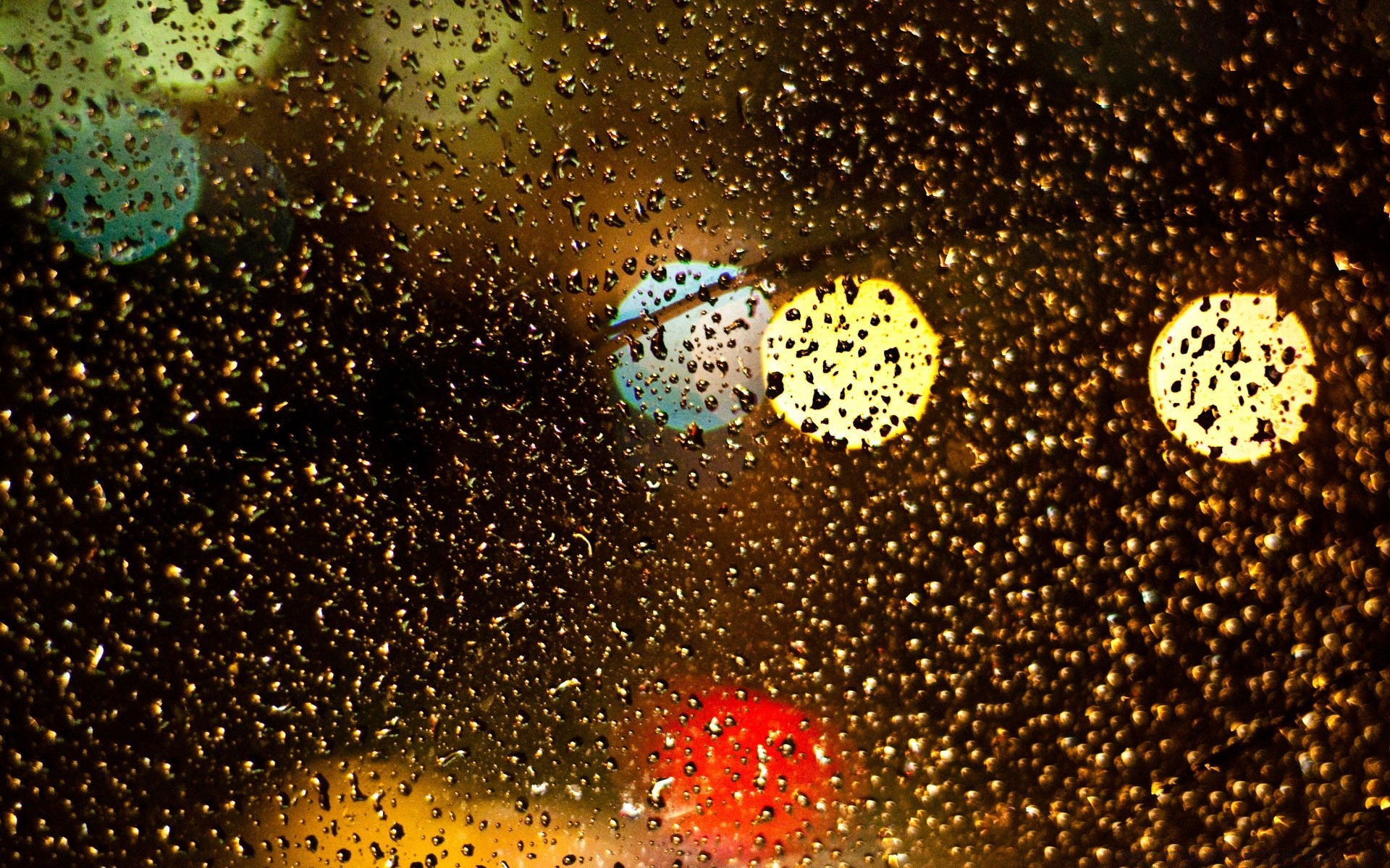 Gotas no vidro e luzes coloridas fora da janela