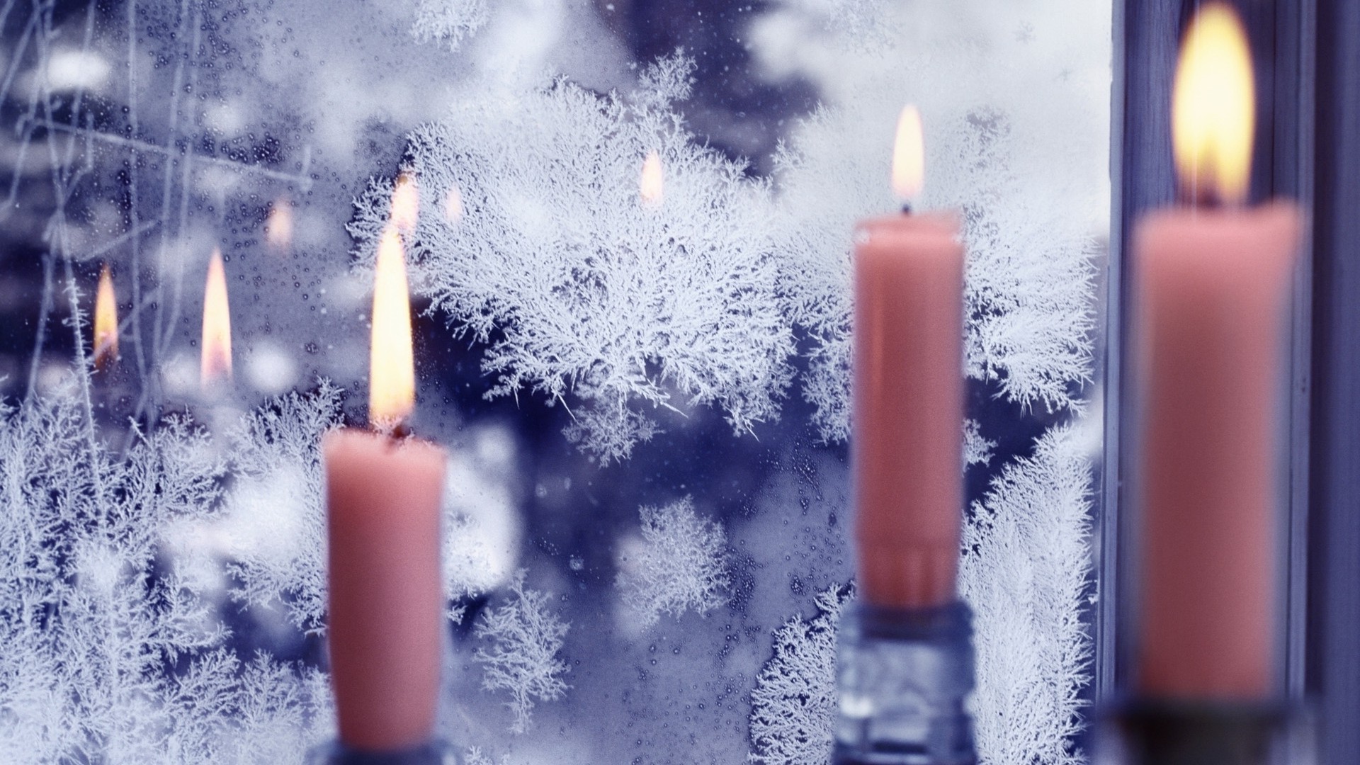 Velas cor-de-rosa fixadas no fundo do vidro congelado