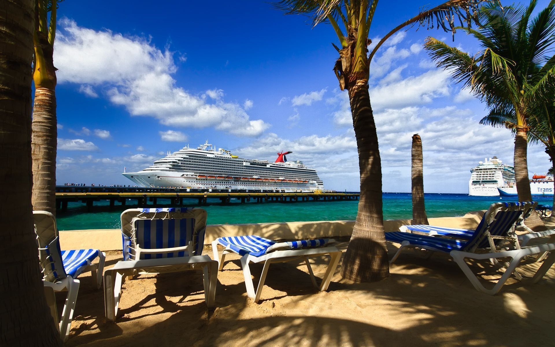 Vista da praia do resort com iate da costa com espreguiçadeiras