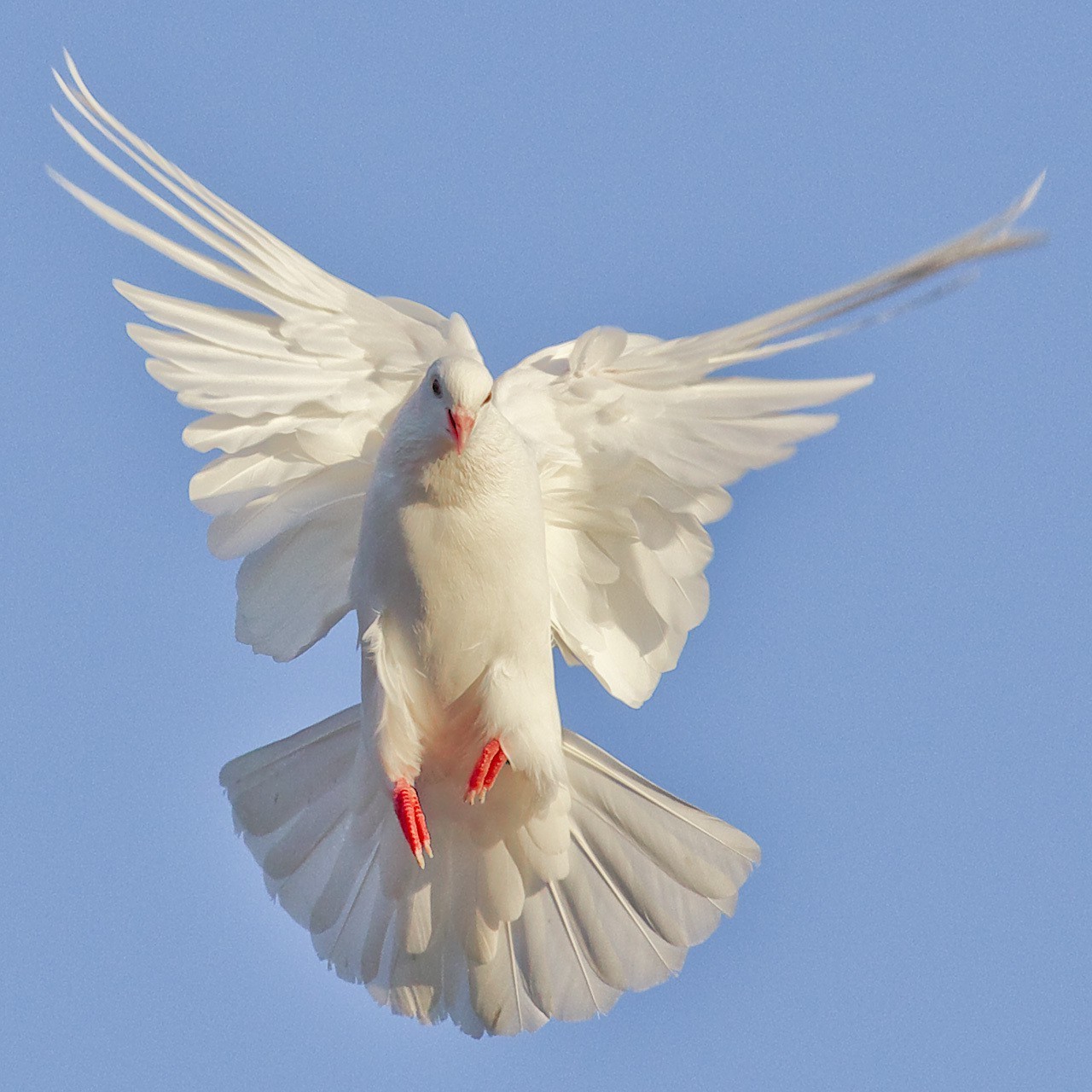 Pomba branca com patas vermelhas em vôo
