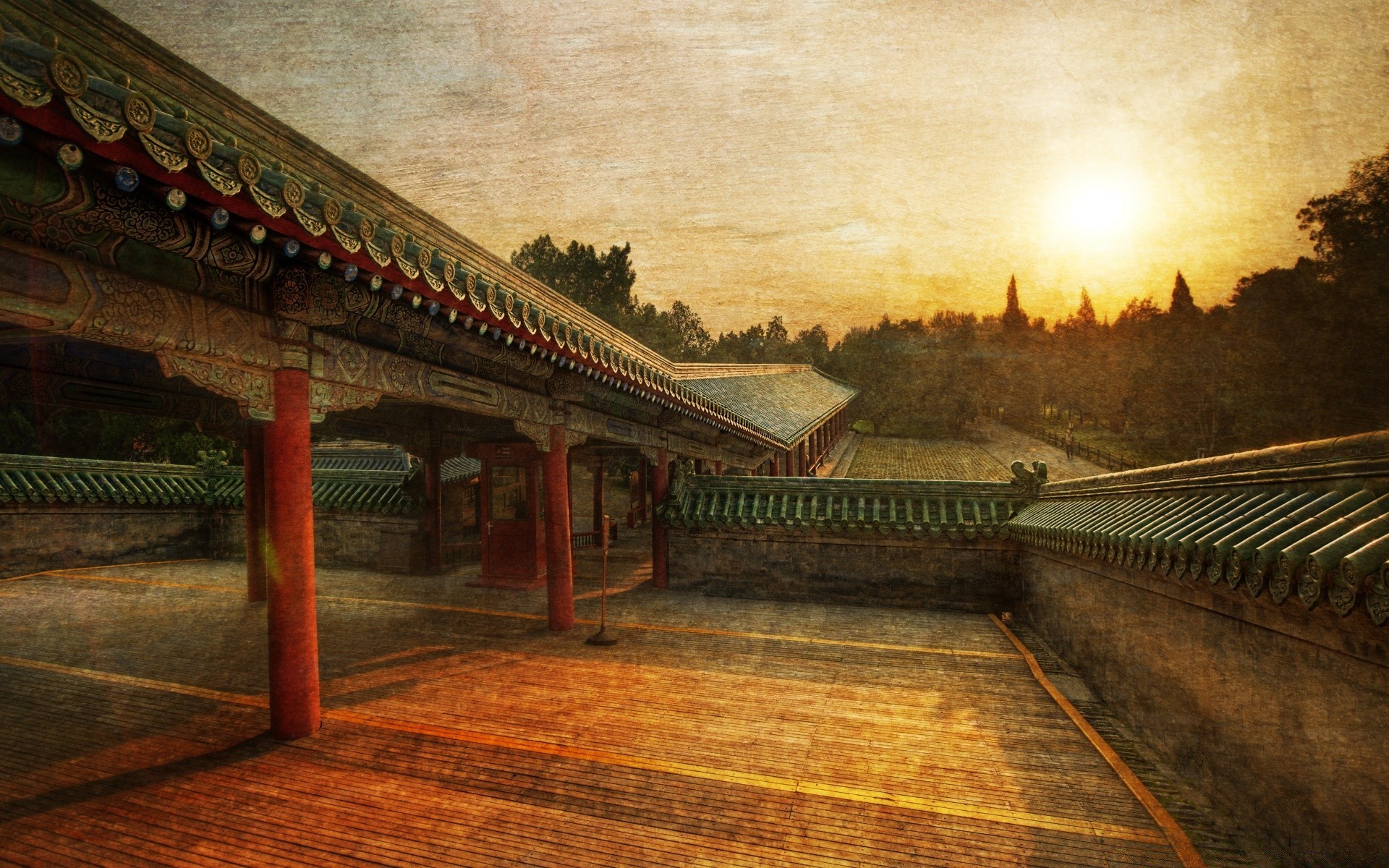 Foto vintage com o templo no fundo do pôr do sol