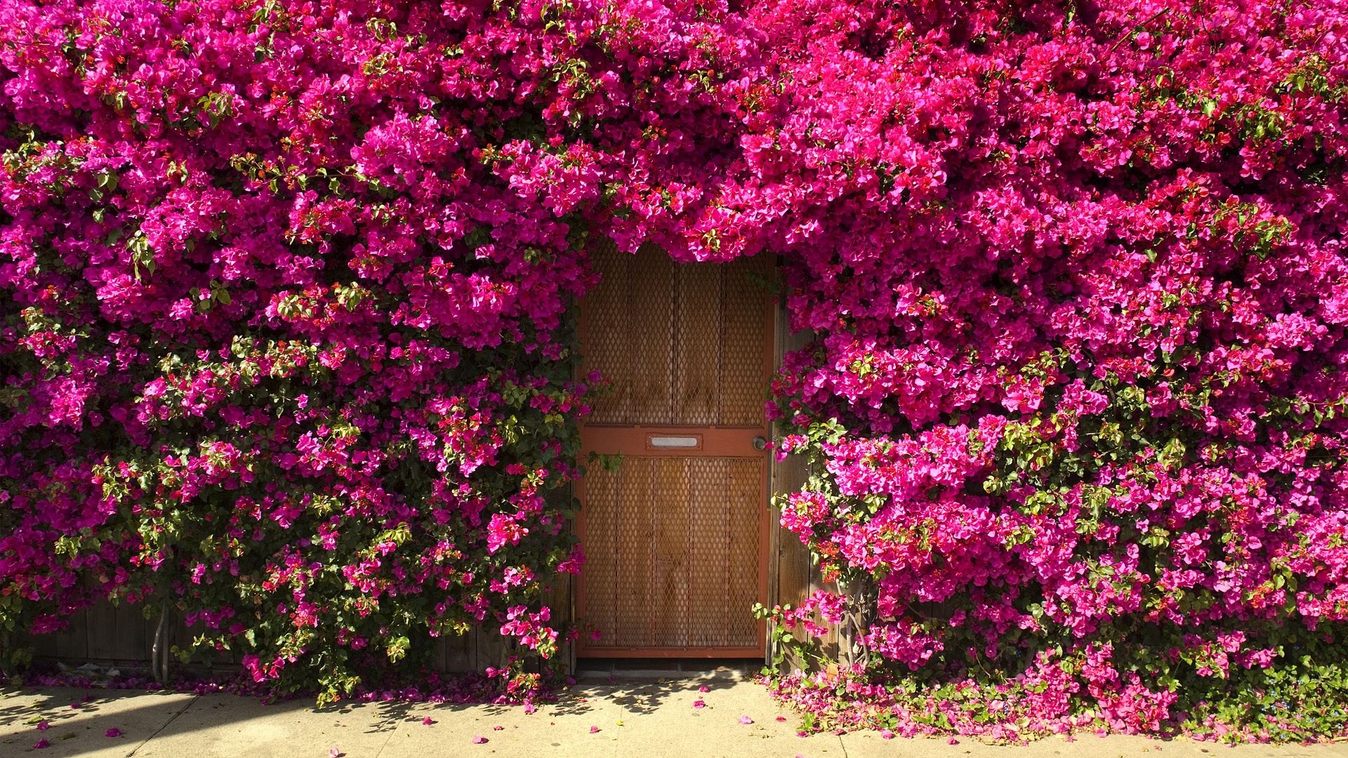Flores cor-de-rosa pela parede ao redor da porta do quintal