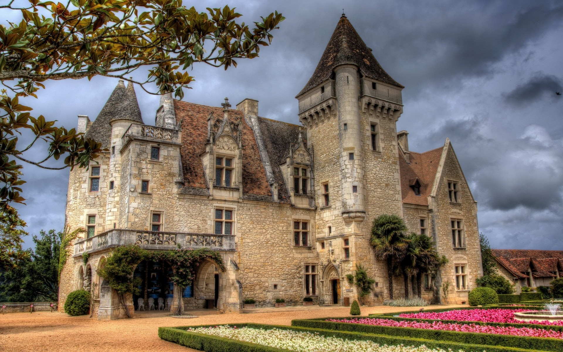 Atrás dos arbustos verdes No fundo do céu castelo cinzento